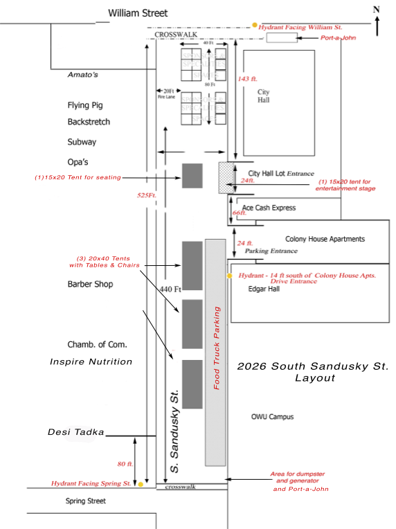 Located in the central business district and less than a block from Ohio Wesleyan University Campus. Closed city streets provides a great arena for sales, fun, food, entertainment, youth art exhibits and children's activities at this very well attended and public supported event.